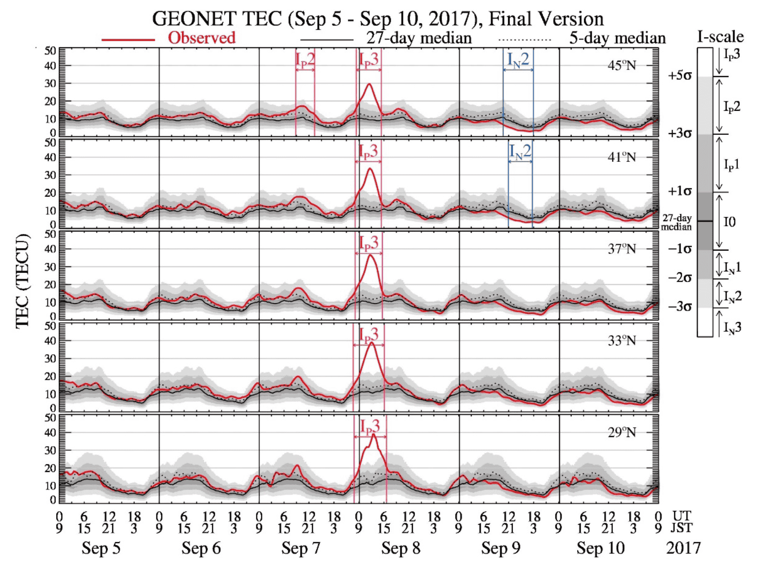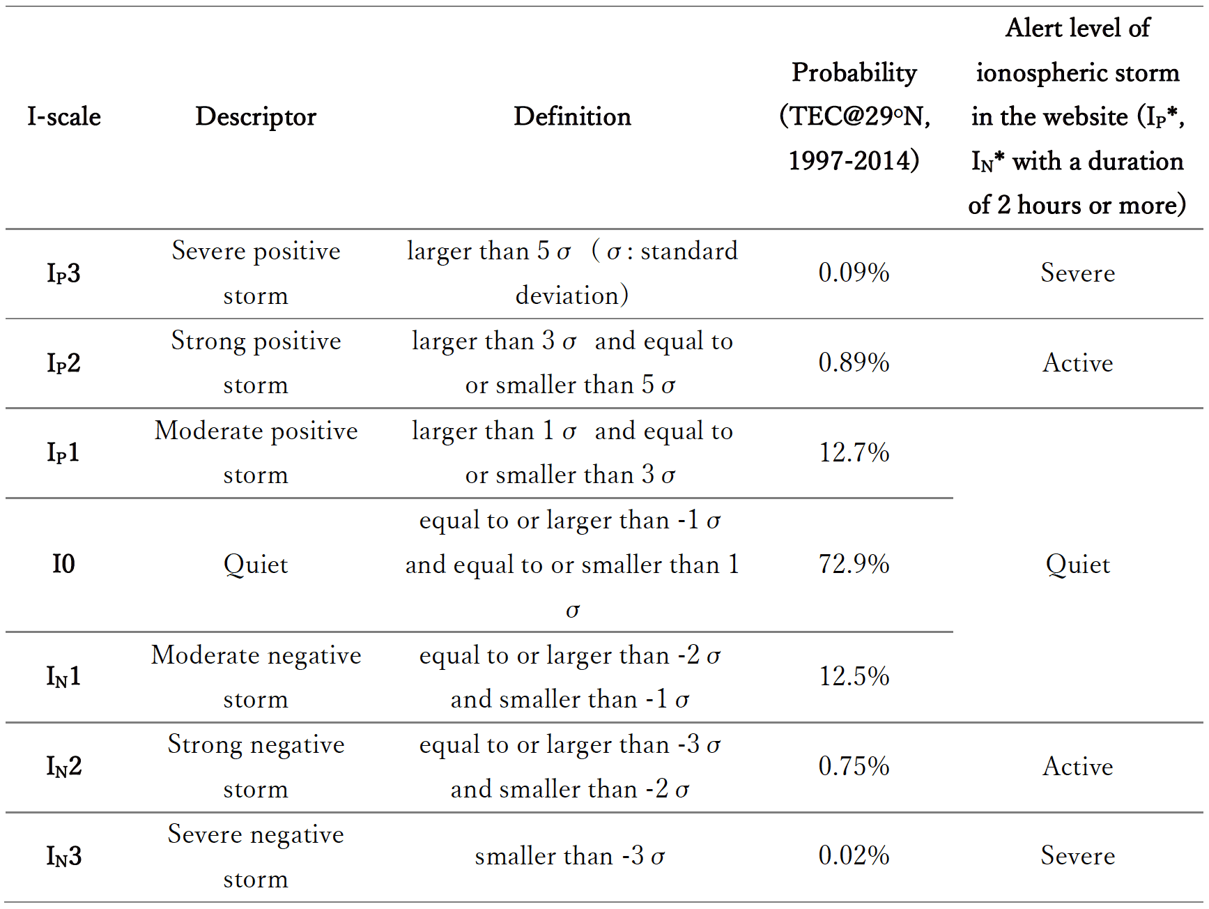 To overcome this problem and specify the level of ionospheric storm, we have developed a new ionospheric storm scale called the I-scale. The I-scale represents the relative level of deviations from the reference level, i.e., 27-day median value, compared with its standard deviation at each latitude, local time, and season over 18 years [Nishioka et al., 2017]. The I-scale is defined by setting thresholds to the normalized numbers to seven categories: I0, IP1, IP2, IP3, IN1, IN2, and IN3, as shown in Table 1. For example, IP3 corresponds to the value larger than 5σ, where σ is the standard deviation. I0 represents a quiet state, and IP1 (IN1), IP2 (IN2), and IP3 (IN3) represent moderate, strong, and severe positive (negative) storms, respectively.