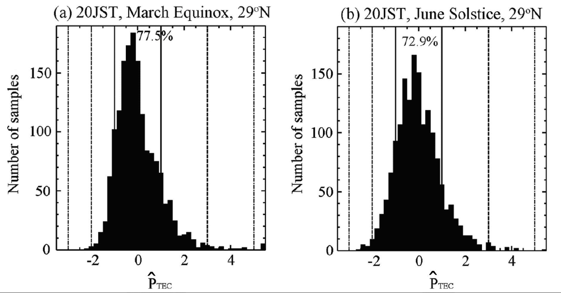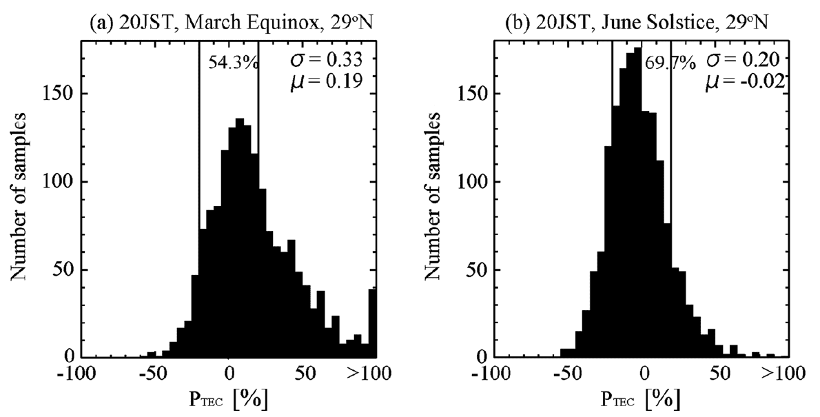 Figure 1 shows an example of the P-value distribution of TEC in the nighttime (20 JST, JST = UT+9 h) at the 29°N latitudinal band (27–31°N) over 18 years. There are significant differences between the histogram profile of P during the March equinox season (Figure 1a) and that during the June solstice season (Figure 1b). The large P-value appears more often during spring, owing to seasonal variation. Figure 2 shows similar plots using the normalized P value. The difference in the P distributions between two seasons is very small; therefore, the difference in the occurrence number of similar P values becomes smaller. Similarly, the distributions of the P value vary among different LT and latitude groups, while the occurrence number becomes similar for similar P values.