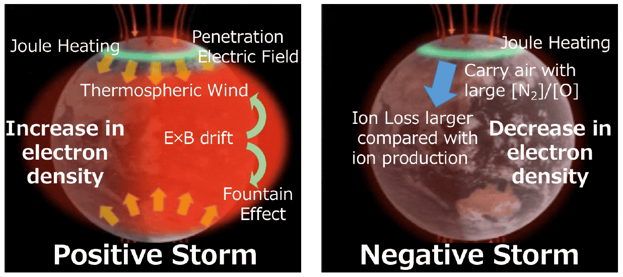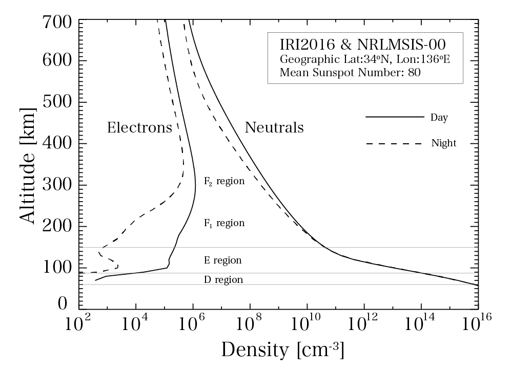 Earth's upper atmosphere is partially ionized due to the absorption of solar ultraviolet rays and X-rays and the impact of energized particles. The ionized atmosphere is called the ionosphere. As shown in the figure, the ionosphere expands over an altitude range from 60 to 1000 km, and is divided into areas such as the D, E, and F regions from its altitude distribution. (Figure 1).