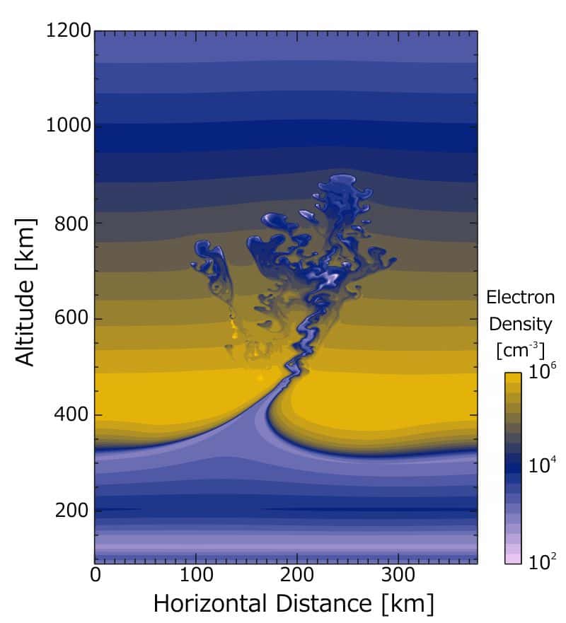 These regions vary both temporarily and spatially in response to variations in solar UV intensity and in the state of the background neutral atmosphere. In the vicinity of Japan, the electron density generally becomes larger at lower latitudes. The electron density has regular temporal variations such as daily and seasonal cycles and the approximately 11-year cycle associated with solar activity. In addition to the periodic variations, irregular disturbances also occur. For example, immediately after a large solar flare, the "Dellinger phenomenon", an irregular increase in the D region electron density, sometimes occurs, which can disrupt radio communications. When the magnetosphere is disturbed, an "ionospheric storm" may occur, in which the F region electron density significantly increases or decreases. Some local fluctuations such as a "sporadic E layer" and "equatorial plasma bubble" also frequently occur in particular seasons.