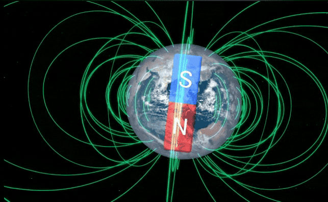 Earth is one of the magnetized planets. Earth’s intrinsic magnetic field is generated by electric currents inside the outer core and it has the S and N poles at the north and south poles, respectively, as can be seen from the fact that the needles of compasses point to the north almost everywhere on the ground. (Figure 1)。
