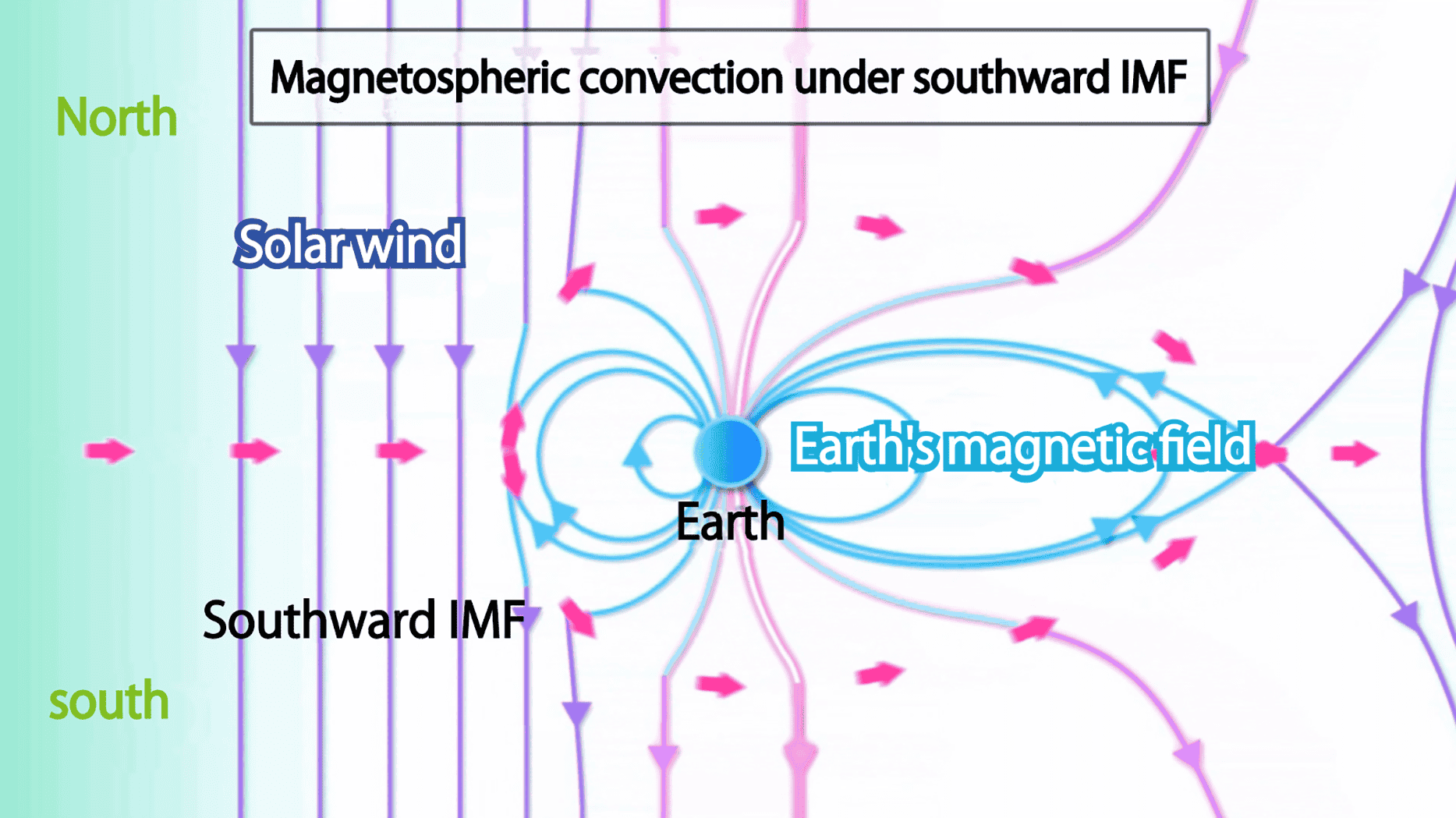 and flow fields, the solar wind flows around the magnetosphere toward the nightside. However, when the IMF arriving at the dayside magnetosphere is directed southward, Earth’s magnetic field and the IMF become antiparallel, resulting in