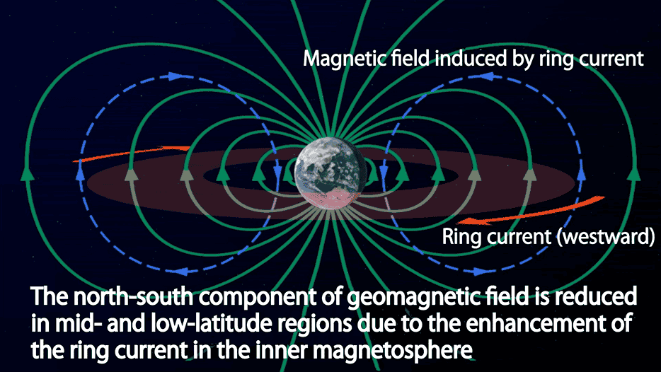 Additionally, geomagnetic storms with or without the compression of the magnetosphere are called ‘sudden commencement types’ and ‘gradual commencement types’, respectively. The development of a ring current is indicated by a decrease in the north-south geomagnetic field component at low and middle latitudes, as shown in Figure 5.
