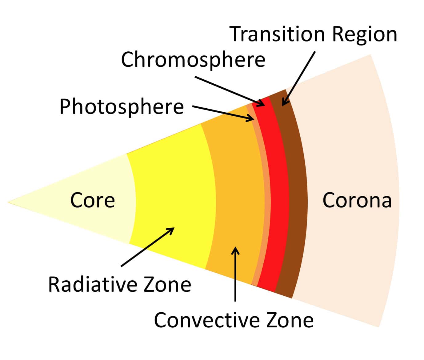 The sun is a star mainly made of hydrogen and helium gas, which has multiple layers in its atmosphere. The photosphere is a visible layer, radiating the white light emission, which is called the solar surface. Black spots in the photosphere are called sunspots, where the magnetic field is stronger and the temperature is lower than the surrounding area. Inside the sun, there are three layers called the core, the radiation layer, and the convection layer in the order from the center. Nuclear fusion takes place at the core, emitting light and heat. Outside of the photosphere are the chromosphere, the transition region, and the corona.