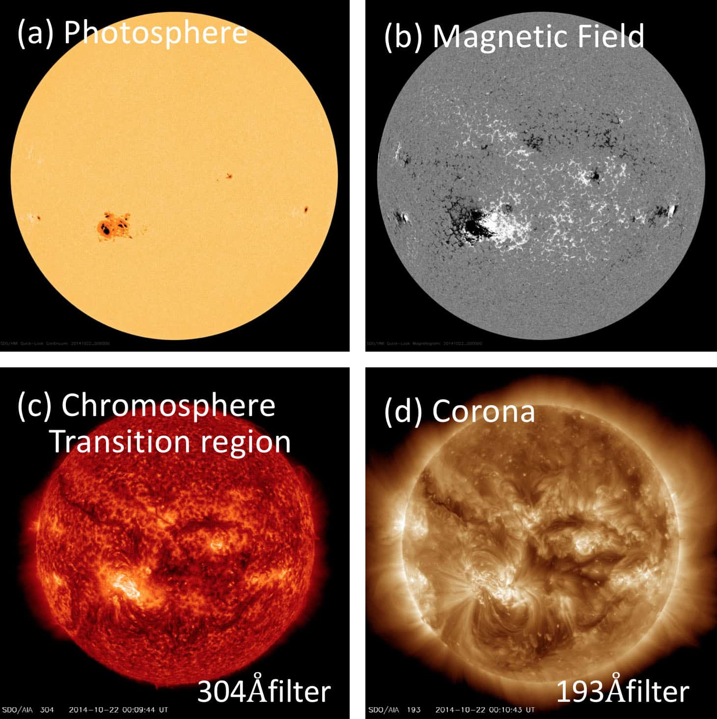 The sun emits multi-wavelength radiation, not only visible light, but also radio, infrared, ultraviolet (UV), X-ray and gamma-ray emissions. Observations by these multi-wavelength emissions reveal the dynamic activity of the sun, which cannot be seen from the white-light emission. Figure 2 shows solar images observed by a satellite with four different wavelengths, : (a) the photosphere observed by the white-light emission, in which there are sunspots, (b) the photospheric magnetic field taken by polarimetric/spectroscopic observations by visible light, (c) the transition region of 5×104 K temperature plasma, observed by extreme-ultraviolet (EUV) emission (304 Å), and (d) the corona observed by EUV emission (193 Å), where active regions above the sunspots are bright. Furthermore, there are ground-based or space telescopes for imaging or spectroscopic observations with X-rays, infrared, and radio emissions.