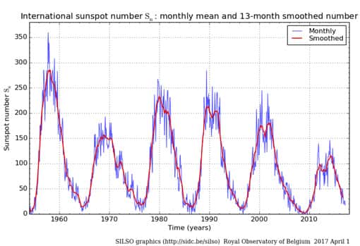 Solar activity varies between active and quiet periods with a period of 11 years (Fig. 4). The number of sunspots also undergoes a similar variation every 11 years. When there are many sunspots, the solar activity is high, and in general, more flares occur. Inversely, when there are no sunspots, no flares occur. This is why the number of sunspots is used as an indicator of solar activity.