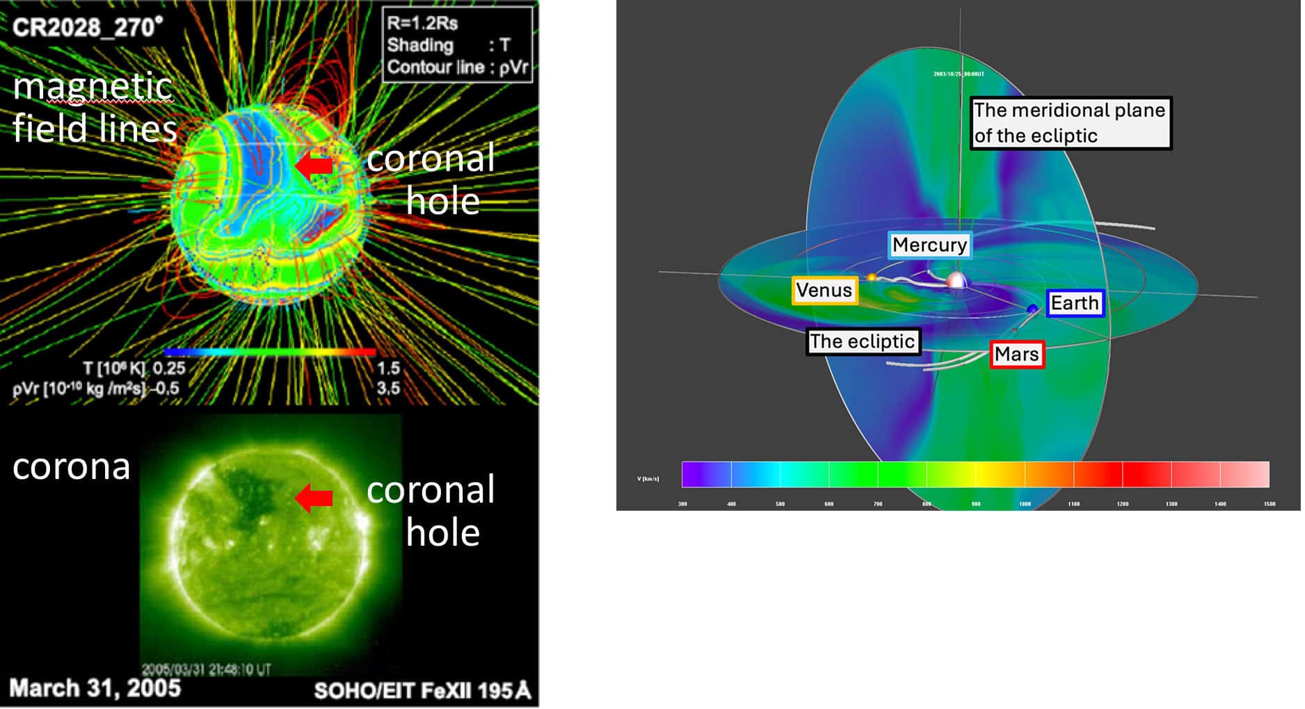 Coronal gas continuously flows out to interstellar space. This stream is called solar wind, which is accelerated to a supersonic speed. In the solar atmosphere, closed magnetic field lines and open field lines are observed, and solar wind is considered to flow along the open field lines. The origin of solar wind is located at coronal holes, where high-speed plasma flow is continuously observed and it makes the region dark. Since the sun and the solar wind corotate with a 27-day period, the solar wind produces a spiral structure with the center at the sun.