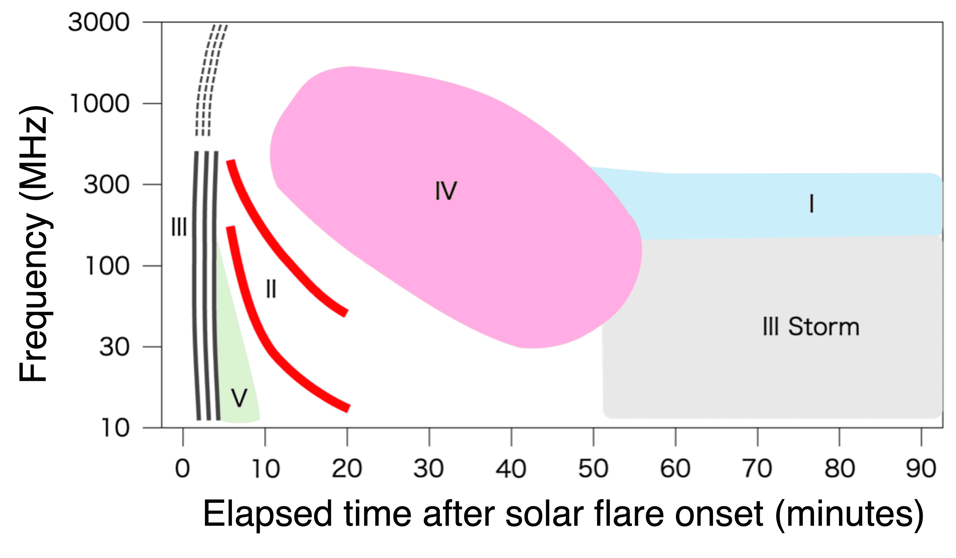 Solar radio bursts are intense radio emissions observed across a wide range of frequencies when explosive phenomena such as solar flares or coronal mass ejections (CMEs) occur. As shown in the figure below, these bursts are classified into five types (I–V) based on the characteristic patterns of frequency drift over time. The spectrum diagram below illustrates the frequency drift and the corresponding types of solar radio bursts.